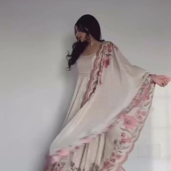 This flowing full sleeve Anarkali kurti pant dupatta set is fully lined for comfort and a smooth, non-transparent drape, making it ready-to-wear for any grand occasion. The ensemble is completed with a matching faux georgette dupatta, featuring complementary floral embroidery along the border. This detailed work ties the entire look together, ensuring a sophisticated and cohesive appeal.