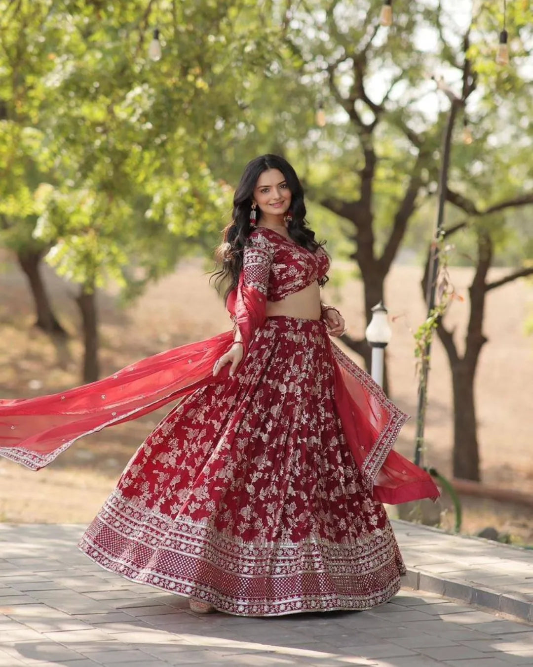 Maroon Floral Embroidered Lehenga Set with Net Dupatta