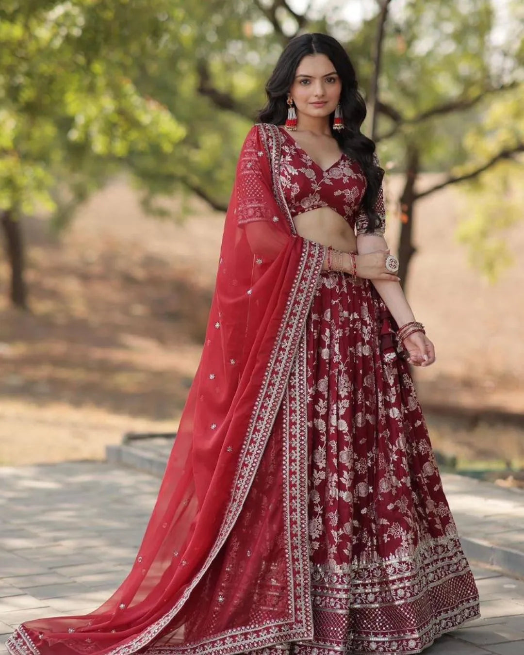Maroon Viscose Jacquard Lehenga Choli with Embroidery