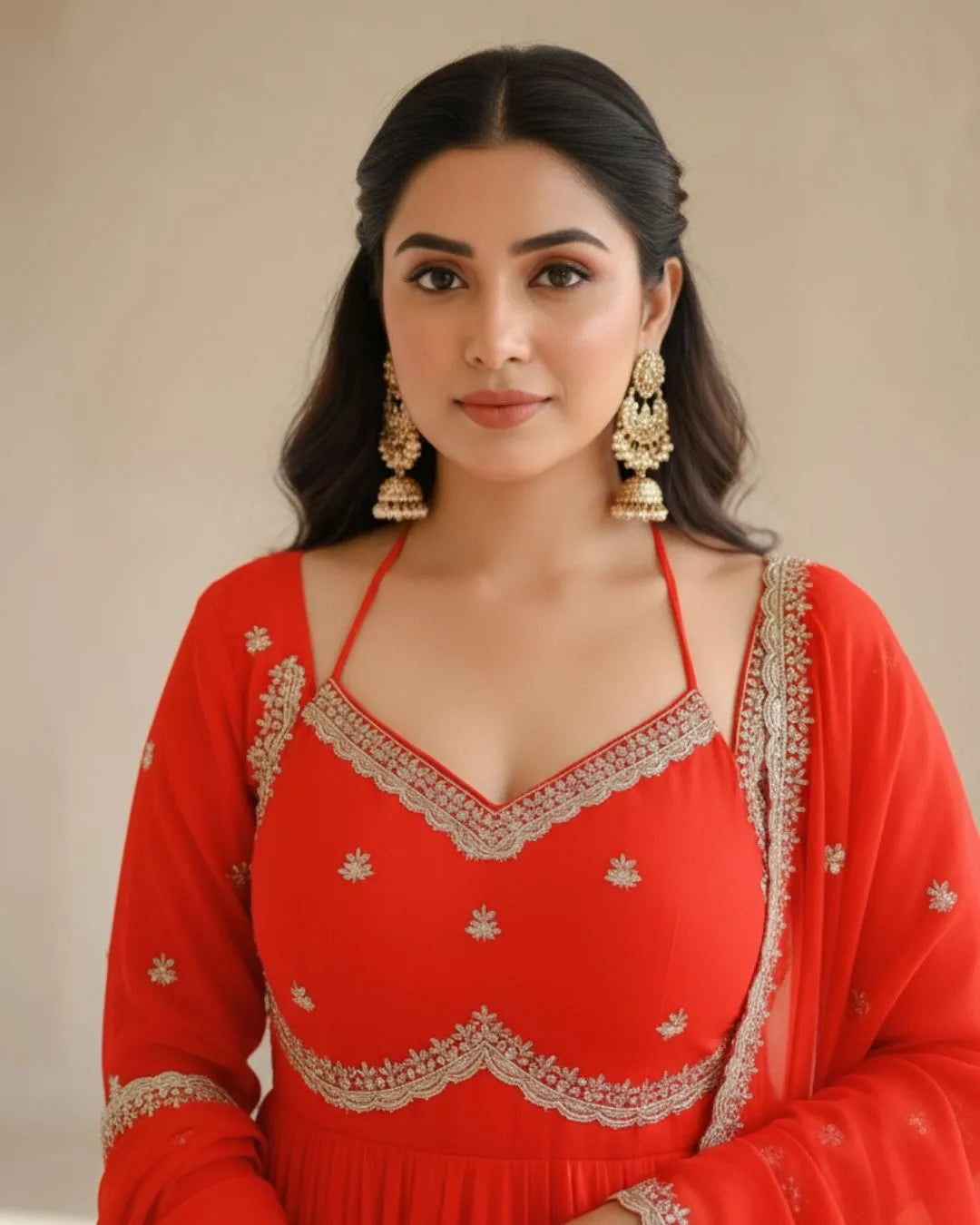 This fully stitched orange color Anarkali dress with dupatta set ensures a perfect and comfortable fit right away. The flowy kurta is paired with soft micro cotton pants, guaranteeing all-day ease. Moreover, the faux georgette fabric and the detailed sequin work provide a luxurious, premium feel. In addition, the matching dupatta is finished with elegant lace borders, gracefully completing this glamorous set for celebrations and formal events.