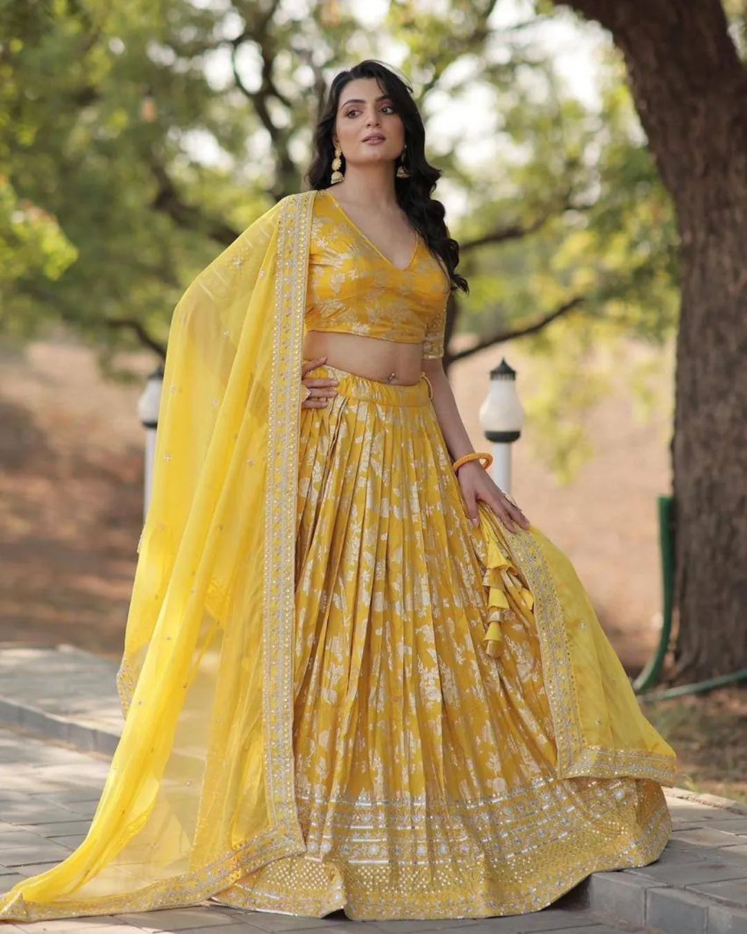 It is made from a nice yellow viscose jacquard lehenga choli with embroidery and has detailed sequin work that shines brightly. The sunny yellow color is perfect for parties and special events. This set is carefully made and will always look good.