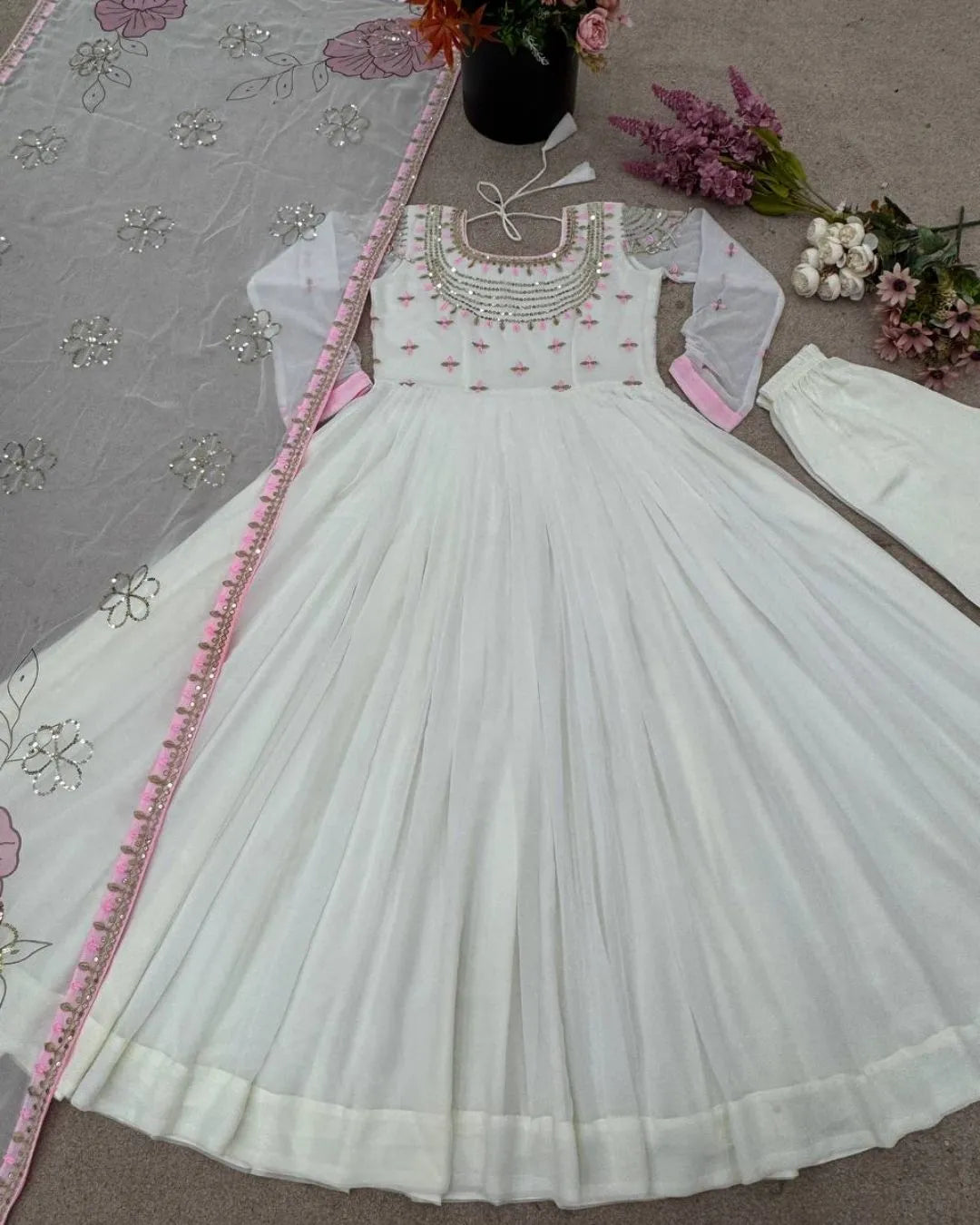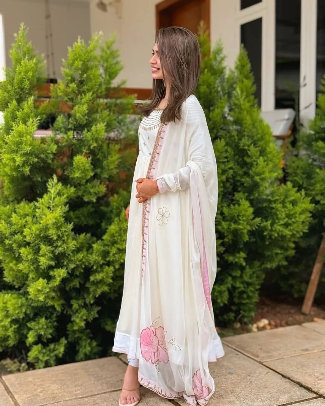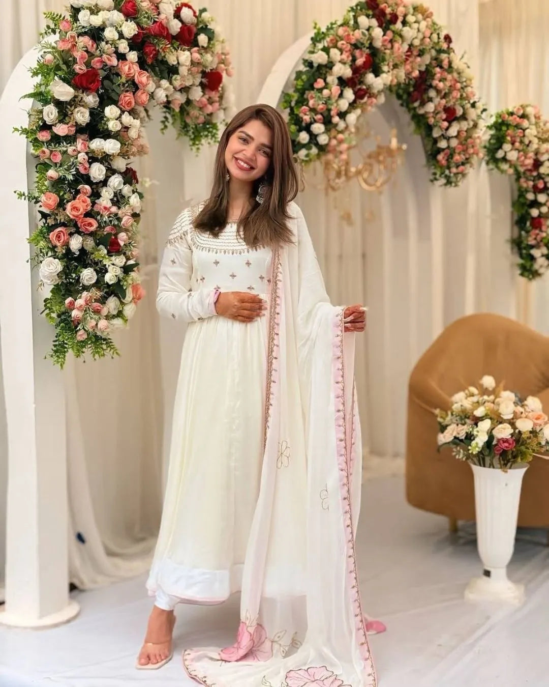 Crafted from premium georgette, the gown has a gorgeous 3-meter flare that drapes gracefully. The set includes a comfortable crepe bottom. Furthermore, a digitally printed and embroidered dupatta completes the look. This stunning white party wear suit set is the perfect fusion of elegance and comfort, offering a beautiful and memorable look.